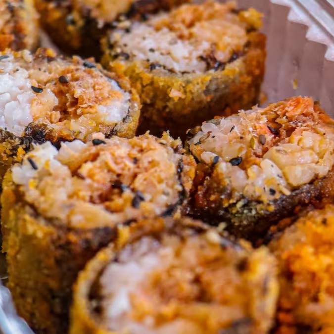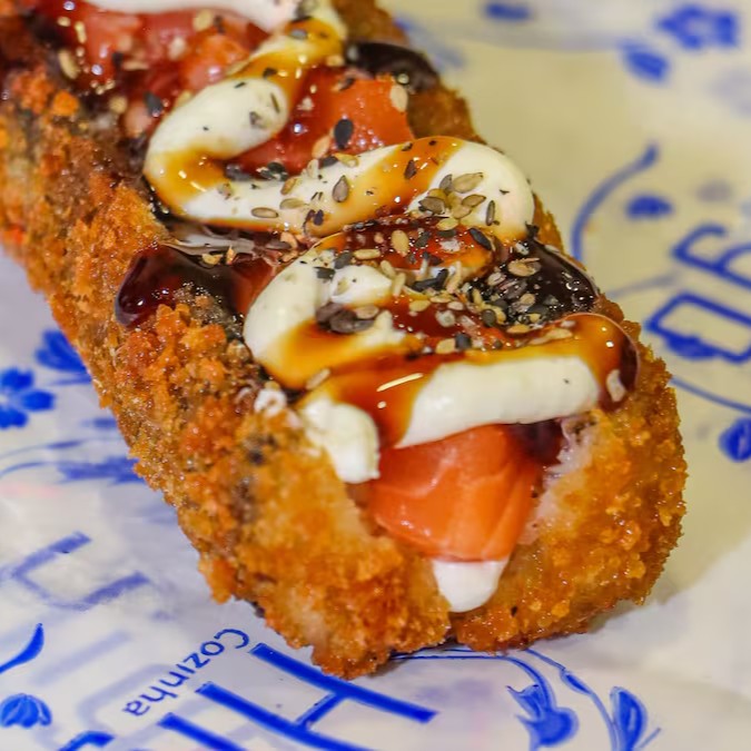 1 unidade - Sushi frito inteiro. Cortado ao meio e recheado com a proteína que escolheu. Finalizado com cream cheese, tarê, gergelim e cebolinha