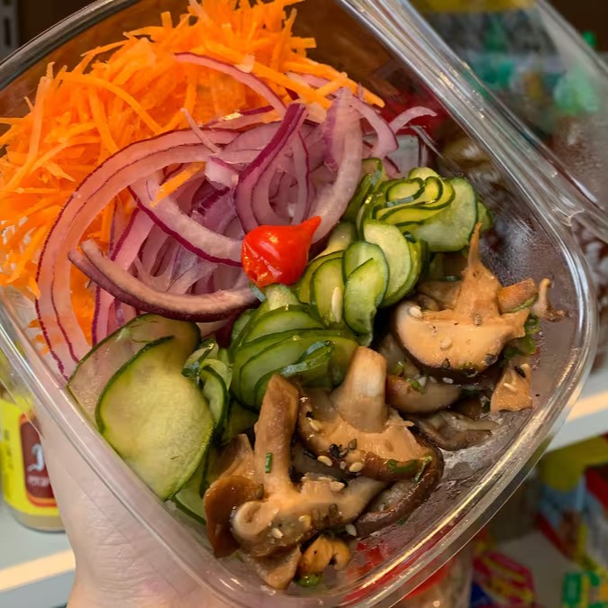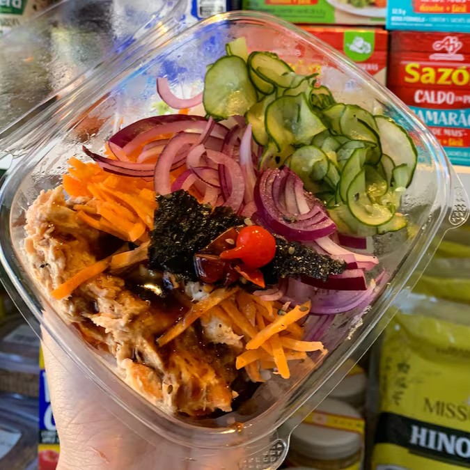 O pokê é composto por: shari (arroz japonês temperado), sunomono, cenoura ralada, cebola roxa, alga, pimenta biquinho e a shitake refogado no shoyu. Finalizado com gergelim.
