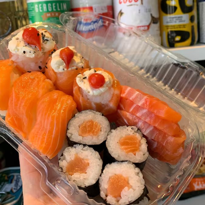 4 hossomaki salmão cru, 4 sashimi salmão, 4 uramaki de salmão cru, pepino, kani e cream cheese, 4 jyo salmão com cream cheese e 4 niguiri salmão. 20 peças