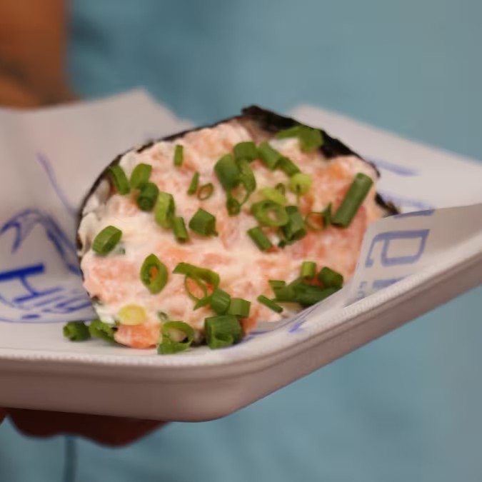 1 Temaki frito cortado ao meio e Meio hot canoa de salmão grelhado