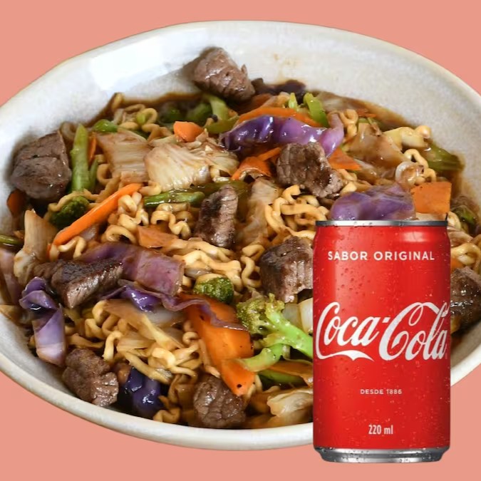 Incrível combo individual, com 1 macarrão yakisoba misto (carne e frango) + 1 refrigerante Coca-Cola 220ml (somente Coca-Cola 220ml Original, não é possível escolher outro tipo de bebida)