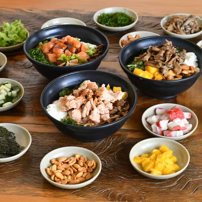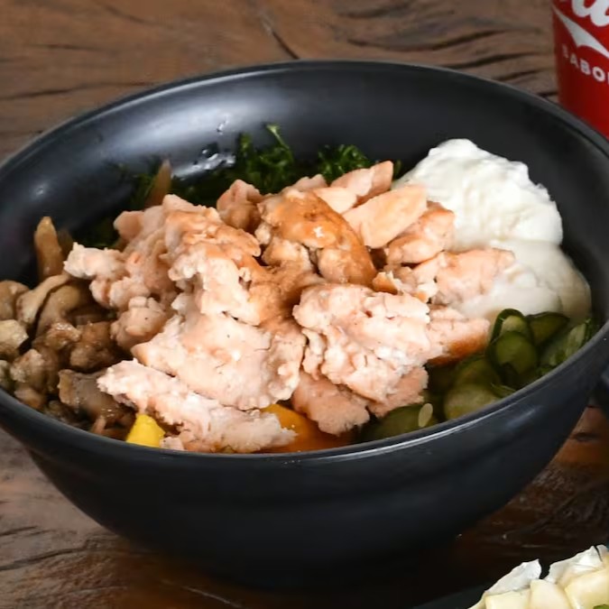 Prato completo montado com arroz de sushi, porção de peixe (160g) + molho e 5 acompanhamentos à escolher.