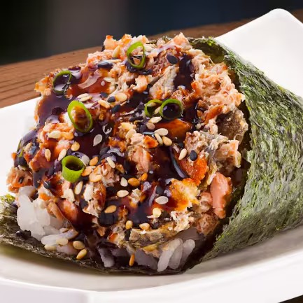 A deliciosa combinação de: salmão cru, acompanhado de shimeji + cream cheese + couve crispy + sunomono e manga. Com molho tarê especial.
