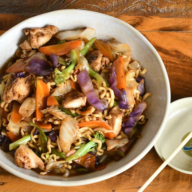 Tradicional macarrão oriental com molho especial do Ige, mix de legumes, alcatra bovina peito de frango em tiras.