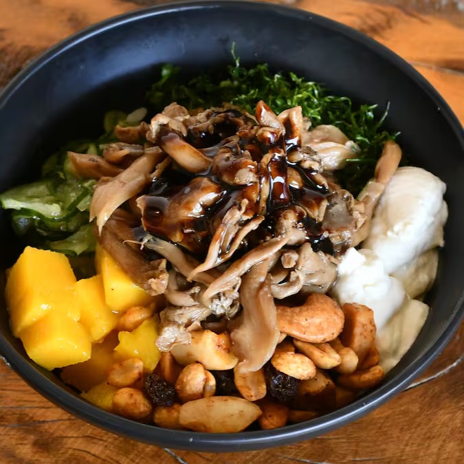 O melhor poke, na versão vegetariana. Eleito para representar todos os vegetarianos, essa deliciosa combinação vai com shimeji, molho tarê e é acompanhada de: cream cheese, mix de castanhas defumadas, couve crispy, sunomono e manga!