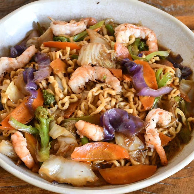 Tradicional macarrão oriental com molho especial do Ige, mix de legumes e camarões.