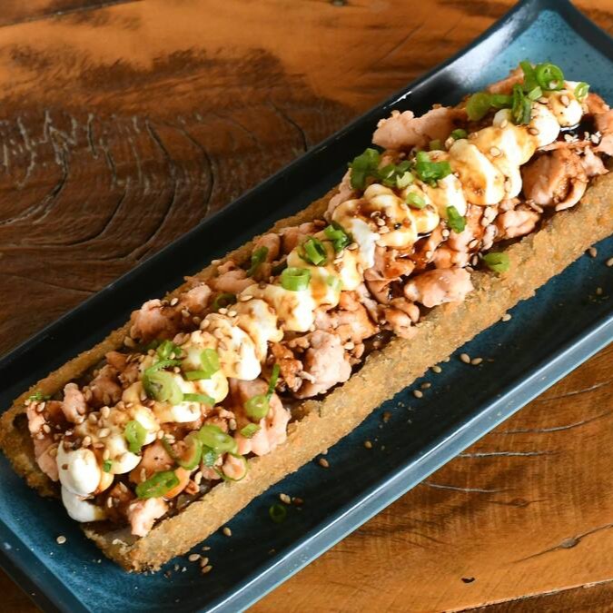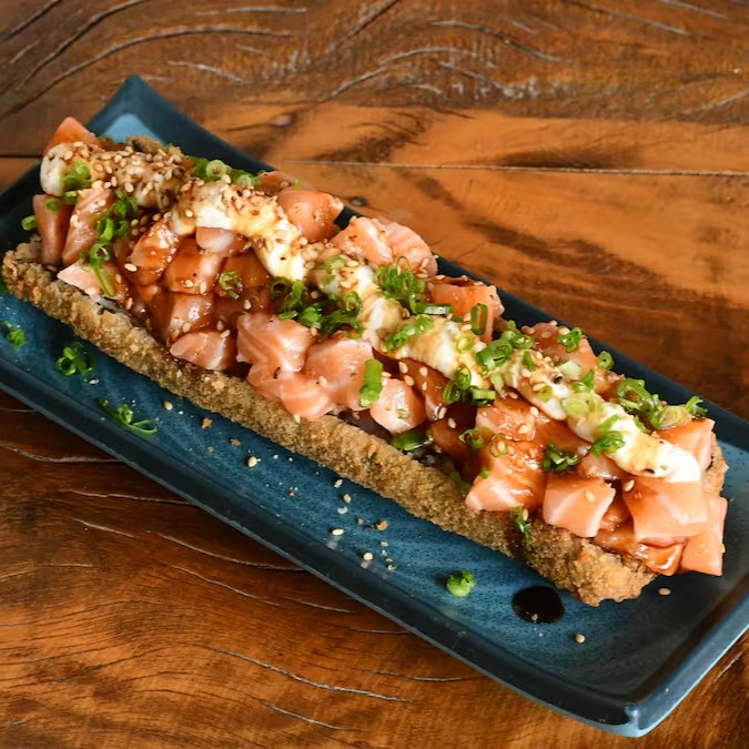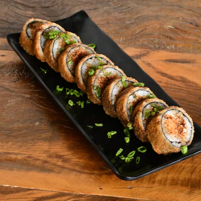 10 unidades de sushi empanado e frito com salmão grelhado, cream cheese e arroz de sushi, finalizado com molho tarê exclusivo do Ige e cebolinha.