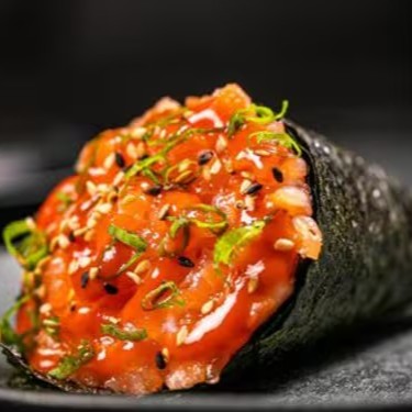Temaki de salmão spicy é ideal para os apaixonados com pimenta, com um toque de sriracha este sabor é perfeito para acompanhar aquela brejinha ;) - Aprox. 180g