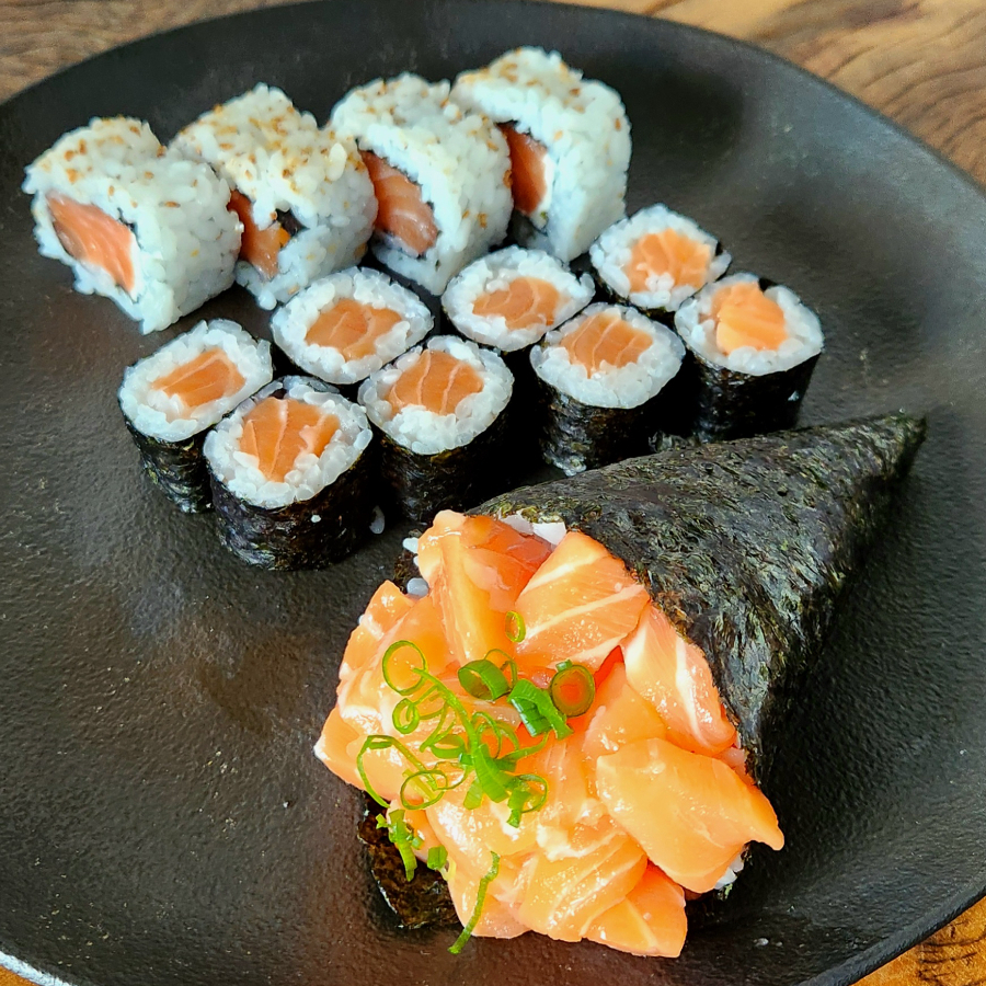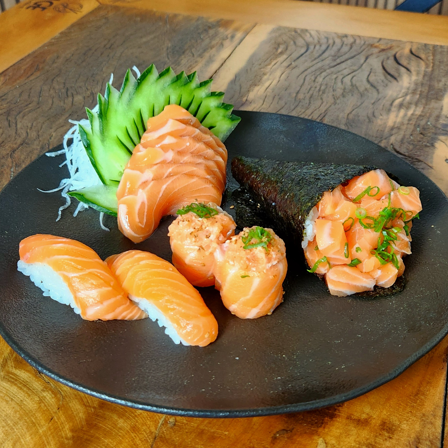 1 temaki salmão + 8 hossomaki salmão + 4 uramaki philadelphia (acompanha kit com 1 hashi, 1 wasabi, 1 shoyu e gengibre)