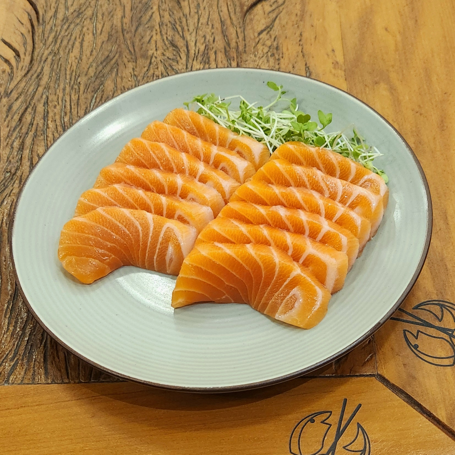 12 fatias de lombo fresco de salmão (acompanha kit com 1 hashi, 1 shoyu, 1 wasabi e gengibre)
