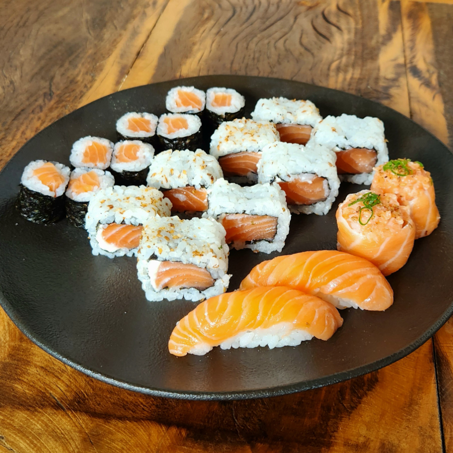 8 uramaki philadelphia + 2 djô + 2 niguiri + 8 hossomaki (tudo de salmão) Acompanha kit com 1 hashi, 1 shoyu, 1 wasabi e gengibre