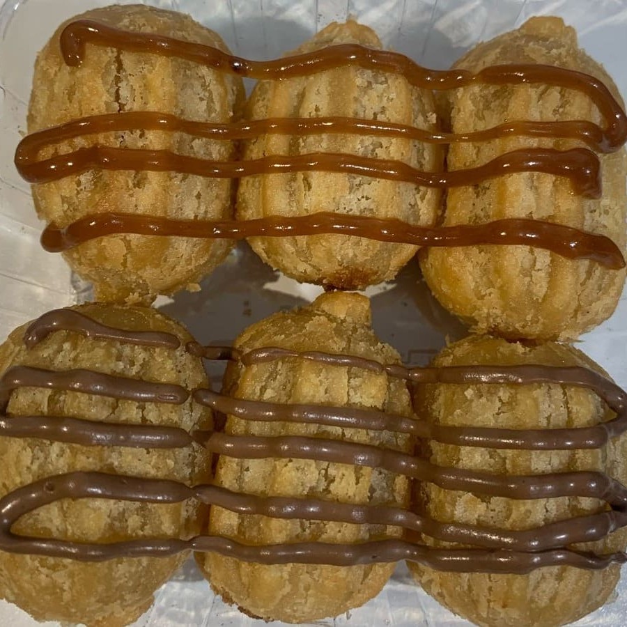 6 unidades de mini churros recheados com doce de leite passados no açúcar e canela com cobertura mista. (doce de leite e creme de avelã).