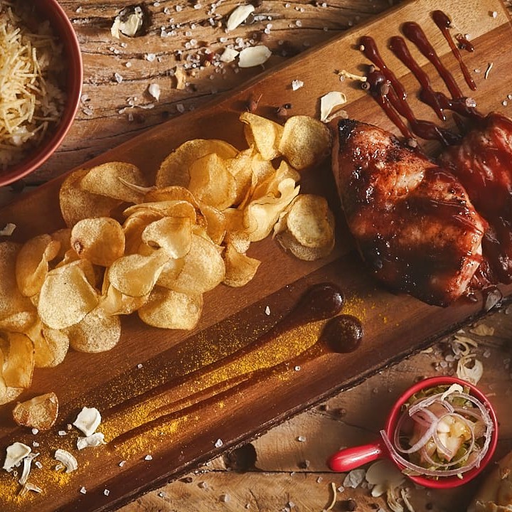 Acompanhamentos: Arroz Branco ou Do Chef + Farofa Artesanal , batata frita artesanal Chips ou Palito + Salada ou Legumes Grelhados com Ervas