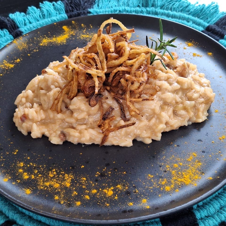 Risoto De Cebola Caramelizada, Bacon, E Crispy De Cebola