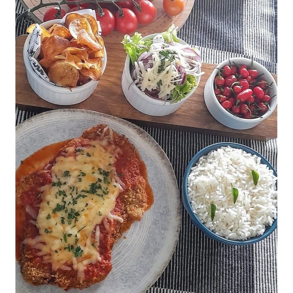 O Parmegiana De Frango Ao Molho Artesanal de Tomate Com Cobertura de Mussarela + Acompanhamentos: Arroz Branco Ou Do Chef, Batata frita artesanal Chips Ou Palito + SaladaLegumes Grelhados no Broiler com Ervas