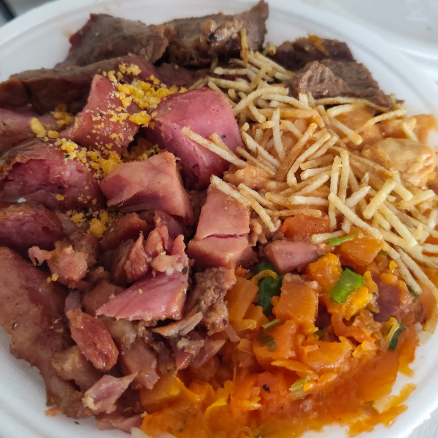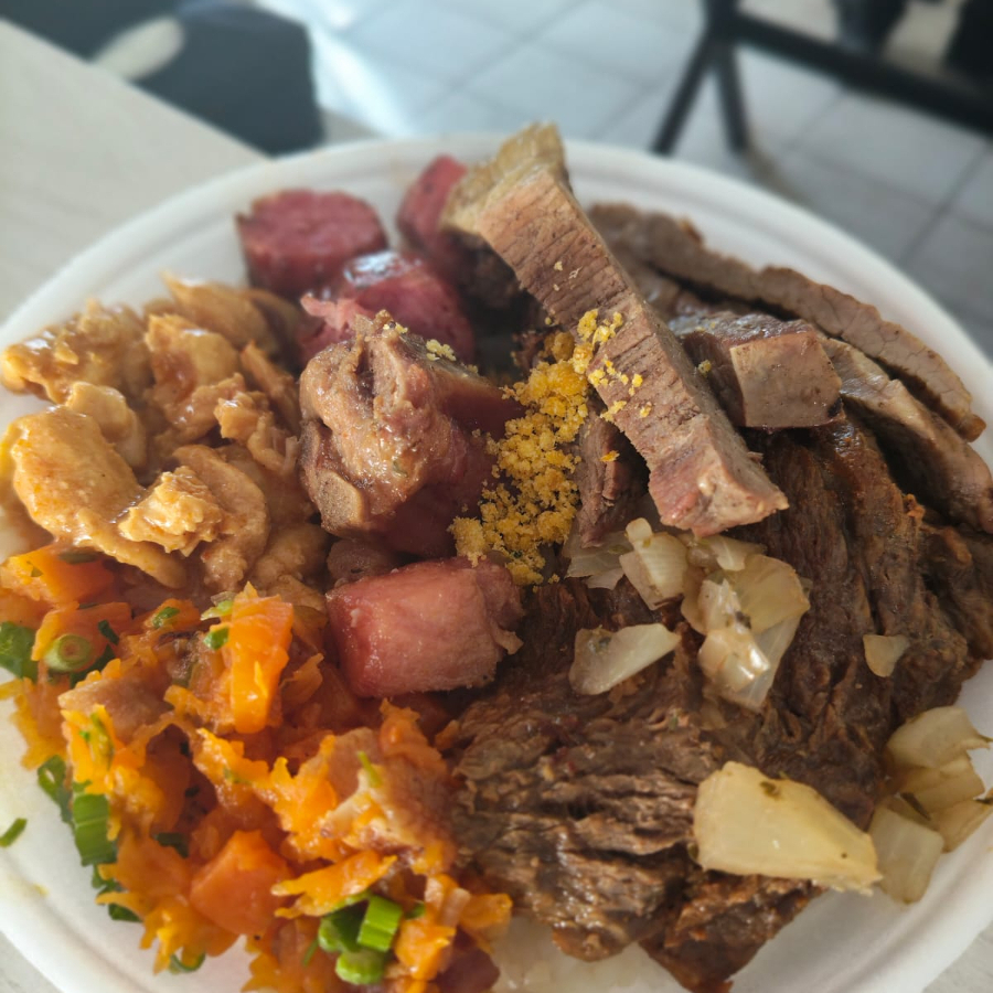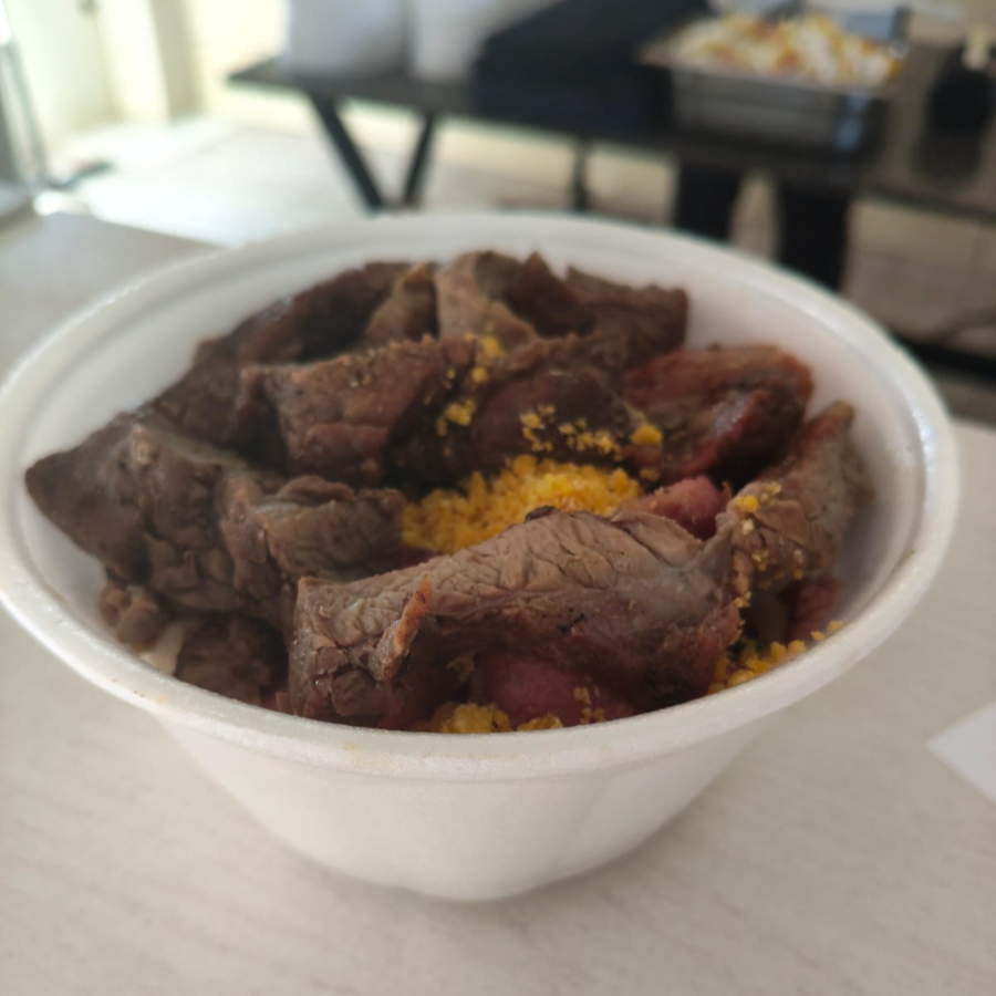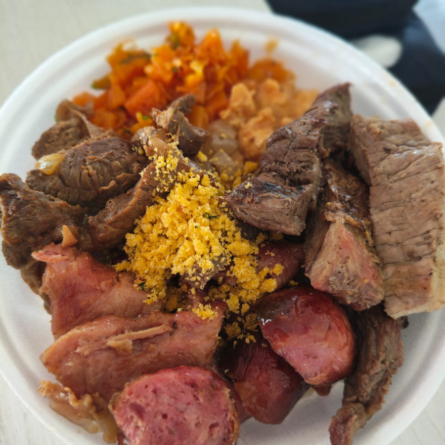 Acompanhamentos: Arroz, Feijão, Carne e linguiça do churrasco e um pouco de farofa temperada
