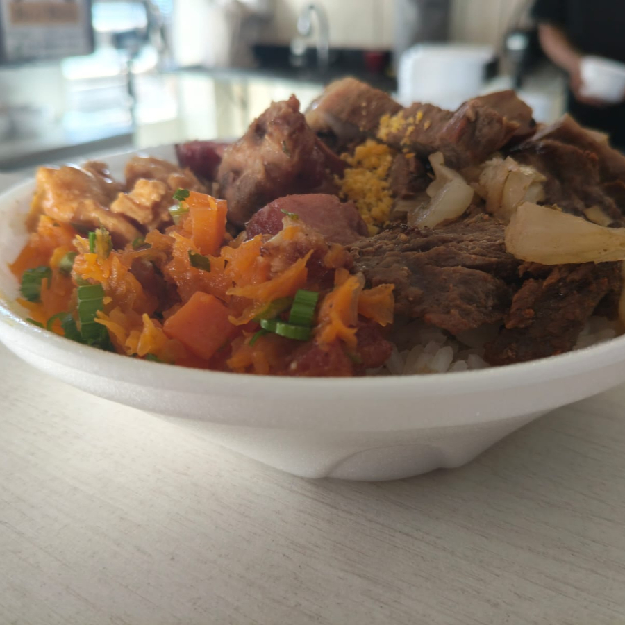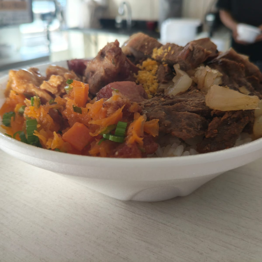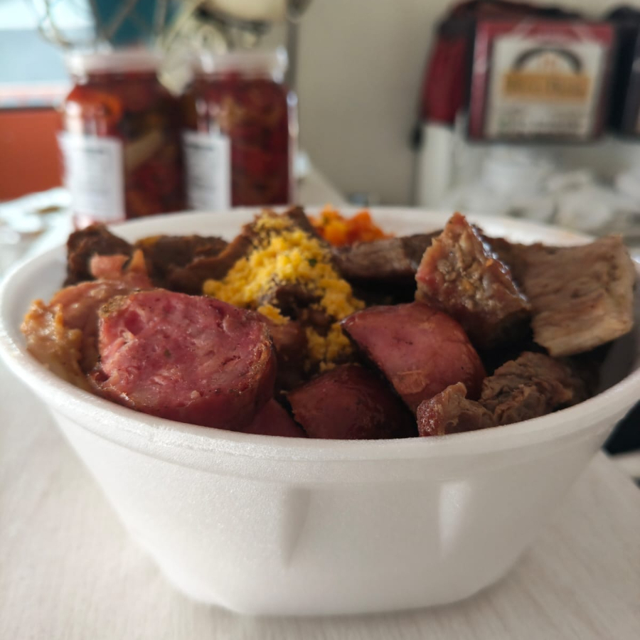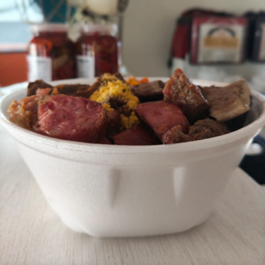 Acompanhamentos: Arroz, Feijão, Carne e linguiça do churrasco e um pouco de farofa temperada