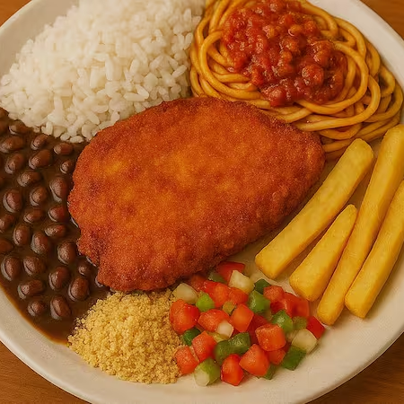 Os acompanhamentos são: Arroz soltinho, Feijão bem temperado, Filé de frango a milanesa, Parmegiana de berinjela, Peixe com batatasrefogado e Churrasco (carne e linguiça), Farofa.