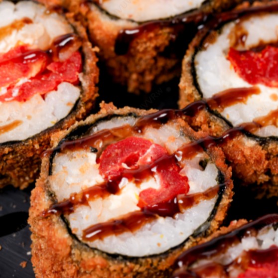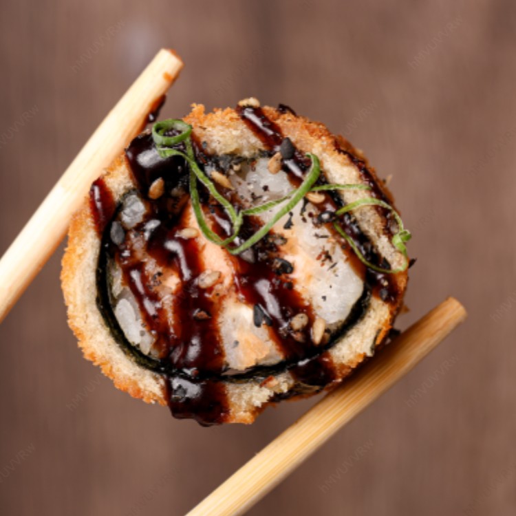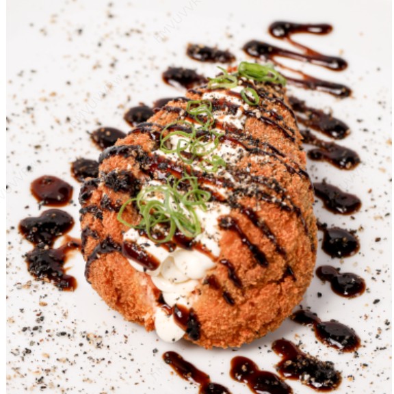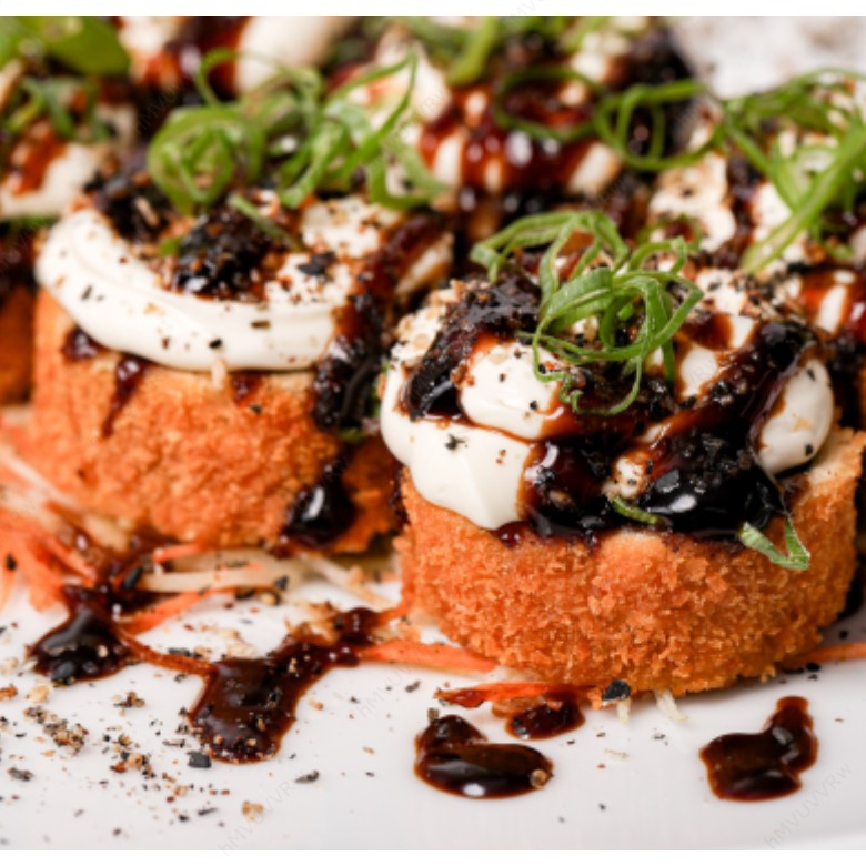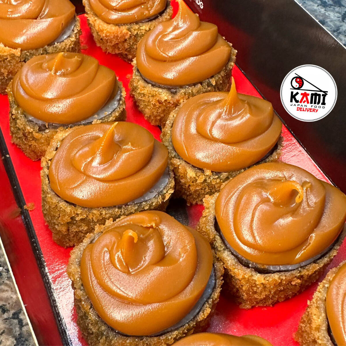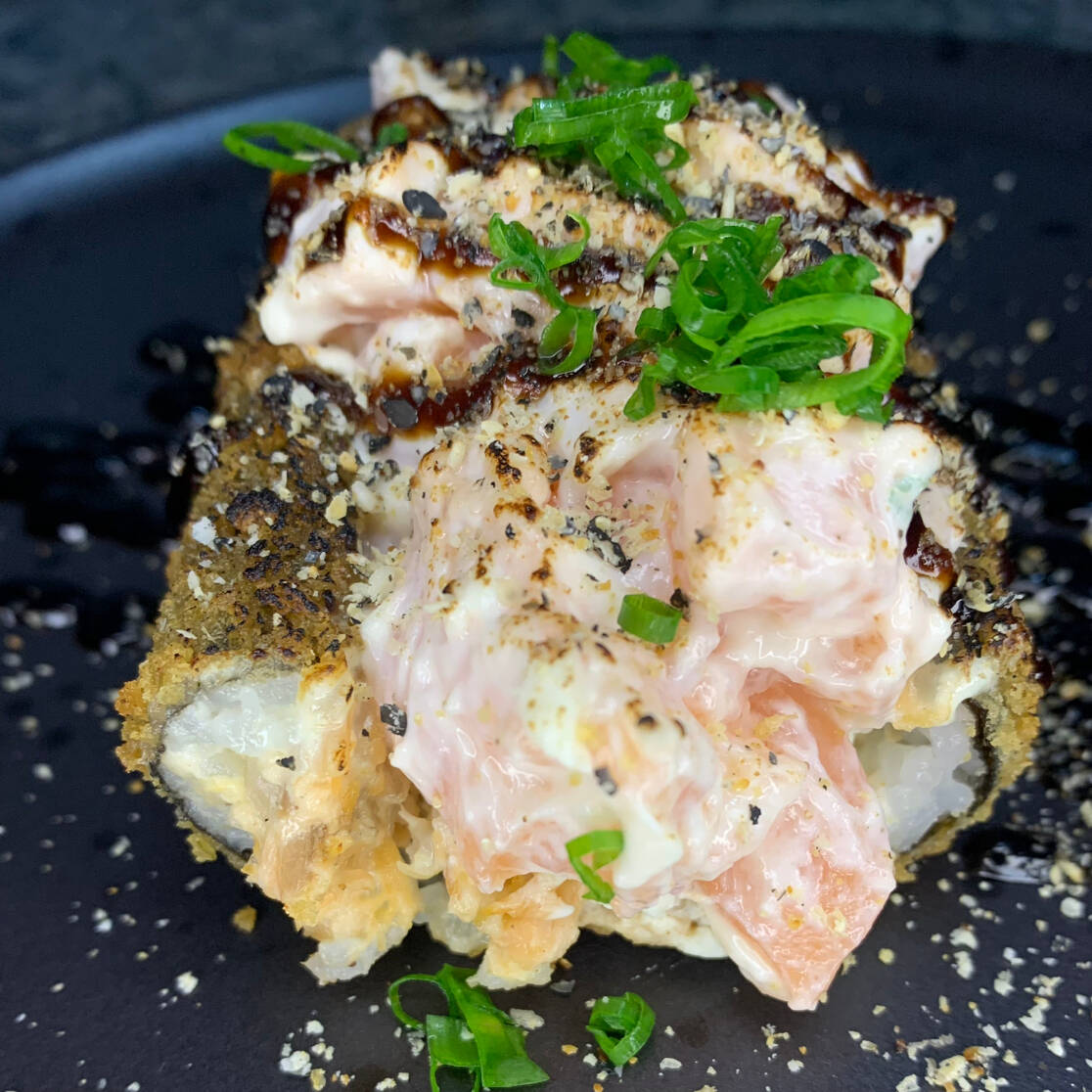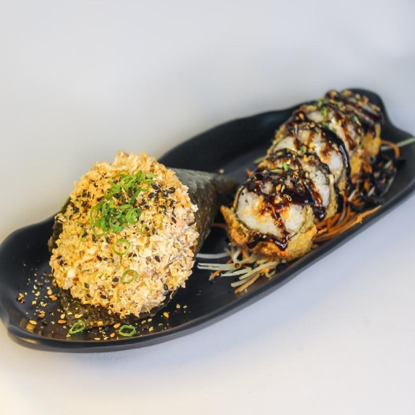 Temaki de salmao grelhado ,com cream chesse e cebolinha ,empanado na farinha panko, cortado ao meio e finalizado com muitoo cream cheese, molho tare e cebolinha