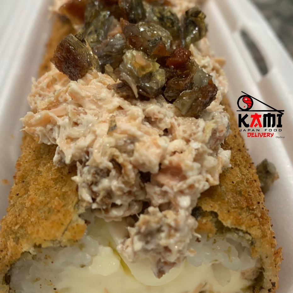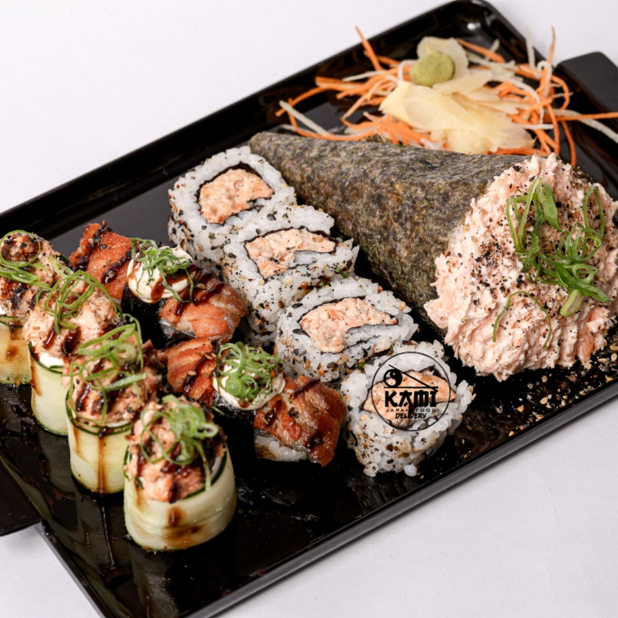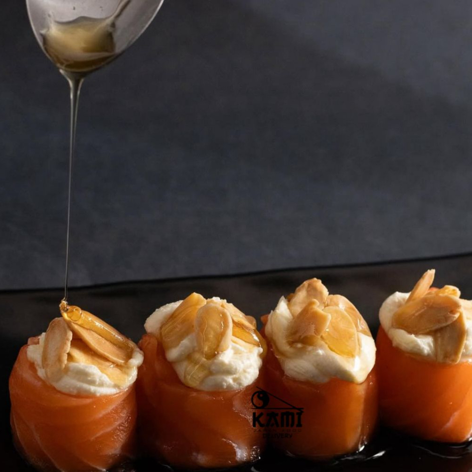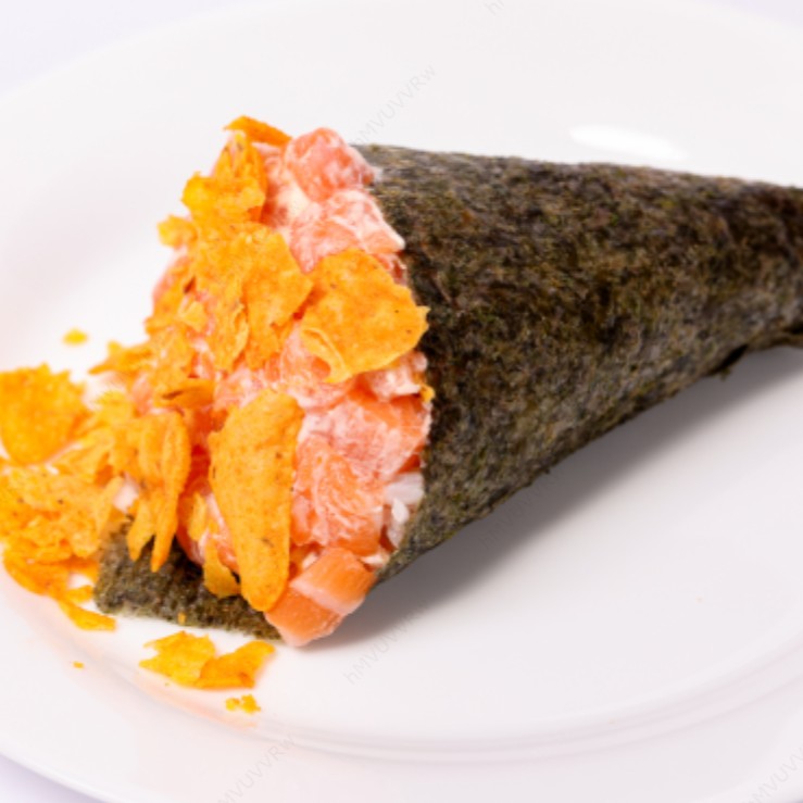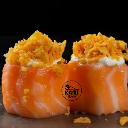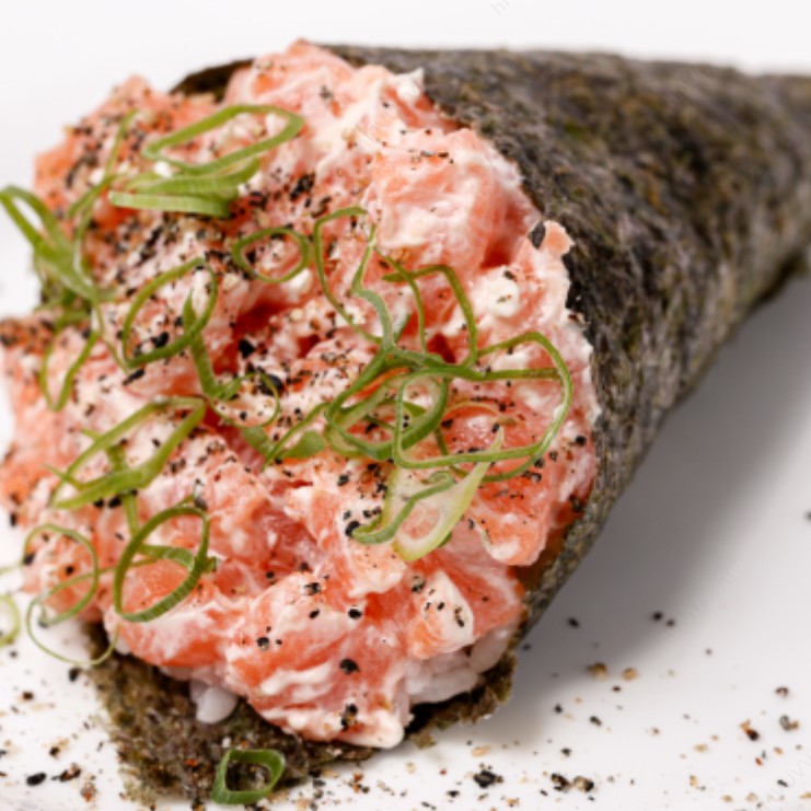 Enrolado em forma de cone, arroz, slmão, kani kama, cream chesse e cebolinha.