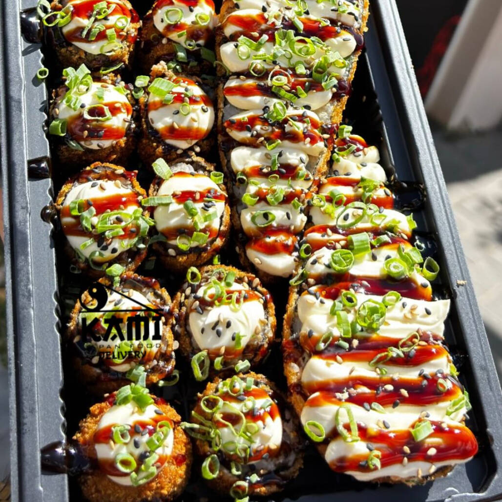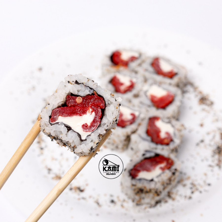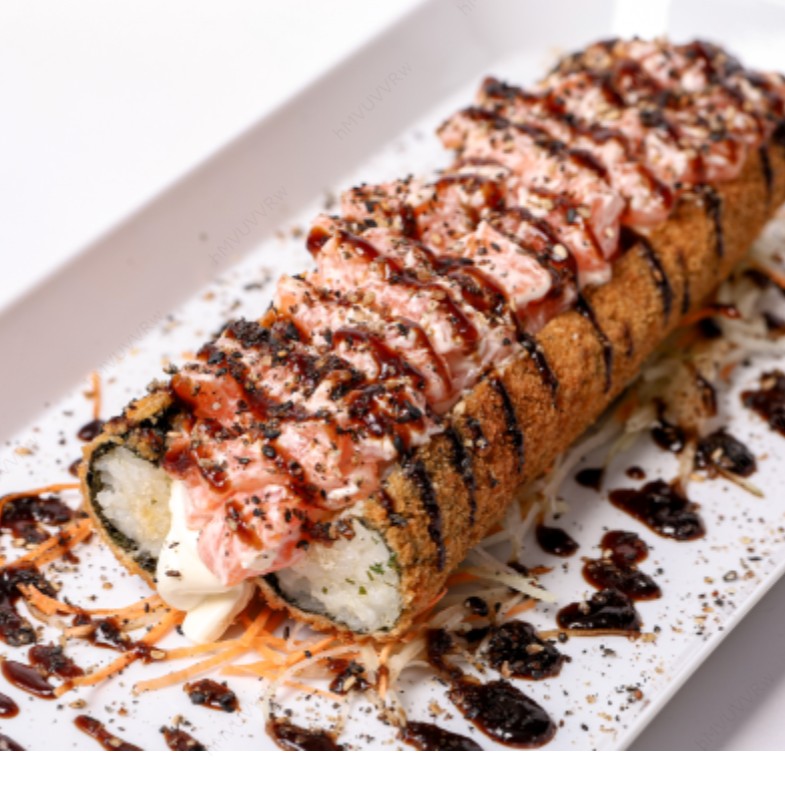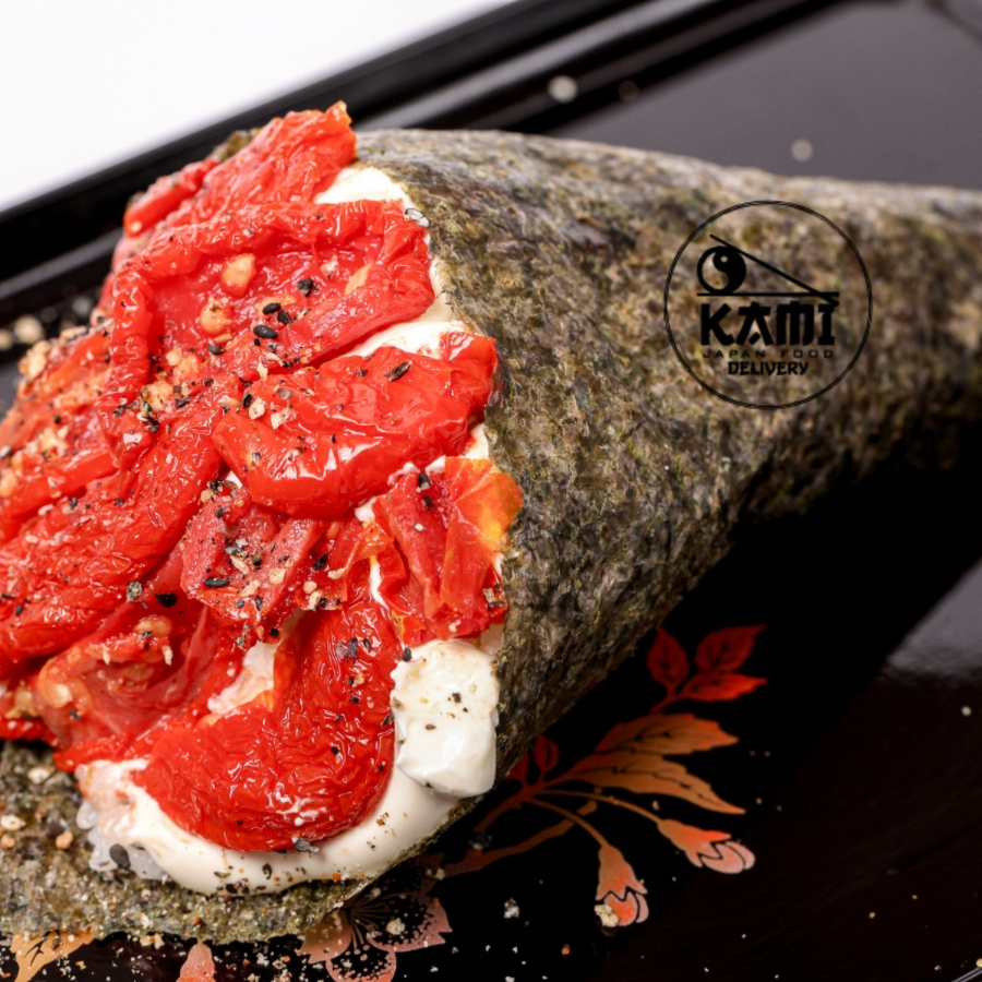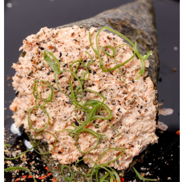 Enrolado em forma de cone, arroz, slmão, kani kama, cream chesse e cebolinha.