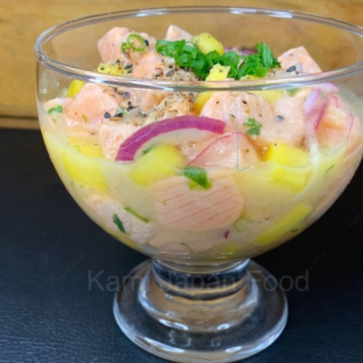 Salmao em cubos ,com cebola roxa, manga, pimenta e cebolinha .