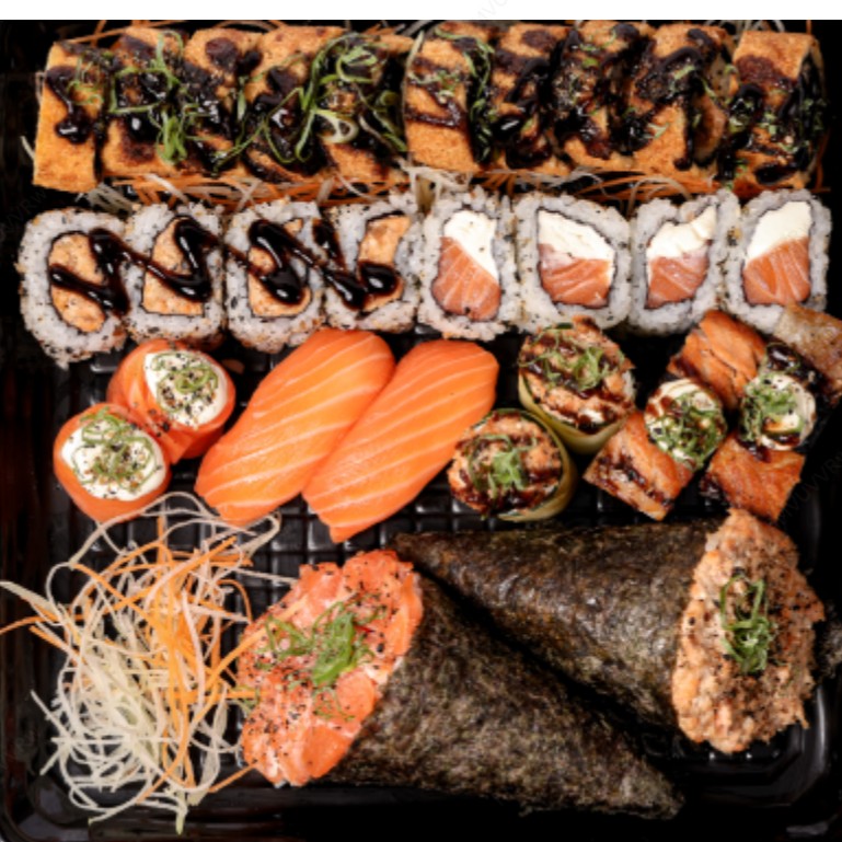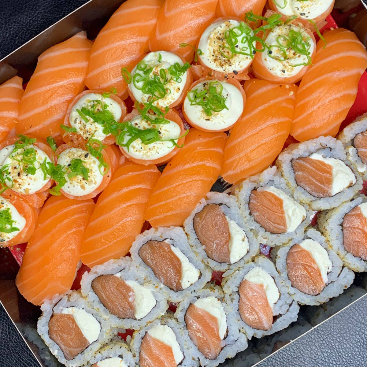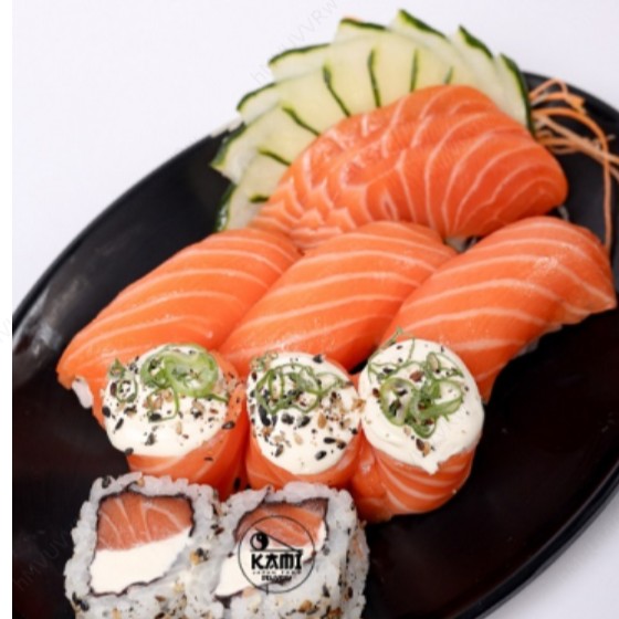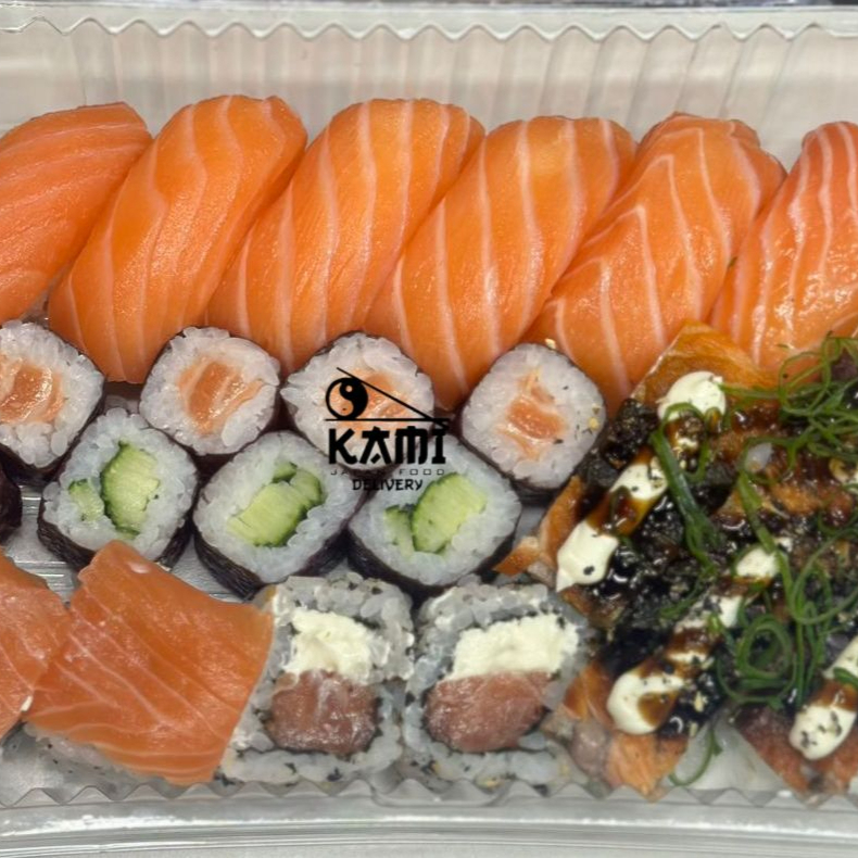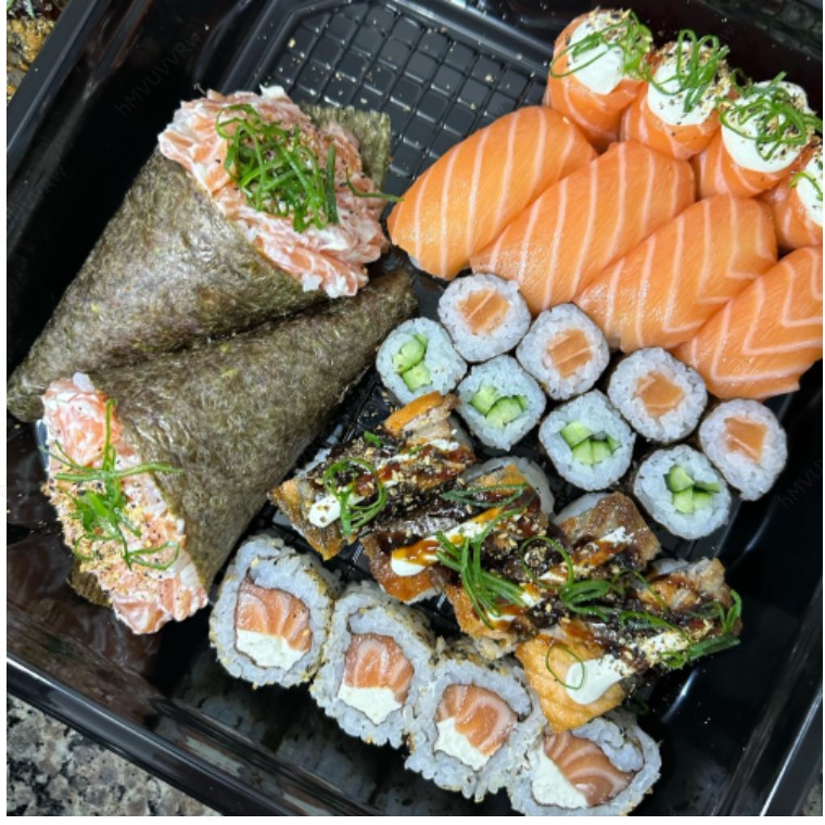 10 unidades de hot roll de salmão grelhado 10 unidades de niguiri de salmão 10 unidades de Joe de salmão 8 unidades de uramaki Philadelphia 8 unidades de uramaki salmão + salmão encima 8 unidades de hossomaki de salmão 8 unidades de uramaki grelhado
