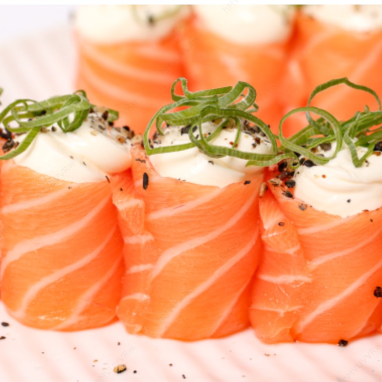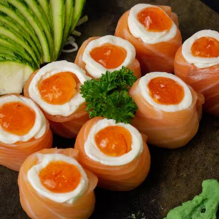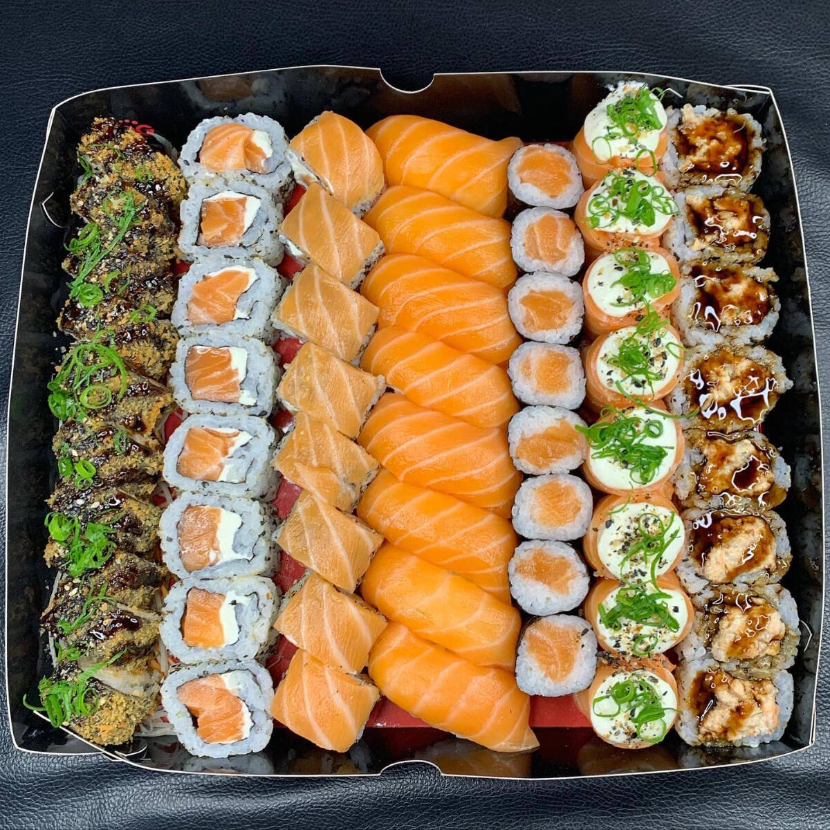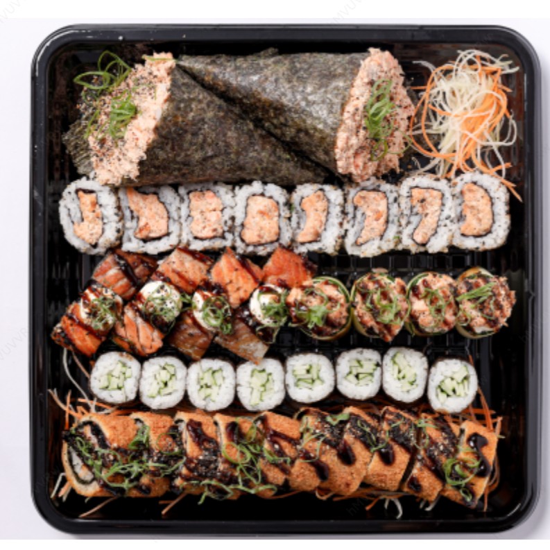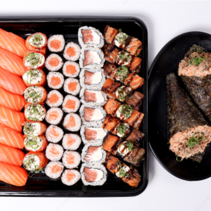 10 unidades de hot roll de salmão grelhado 10 unidades de niguiri de salmão 10 unidades de Joe de salmão 8 unidades de uramaki Philadelphia 8 unidades de uramaki salmão + salmão encima 8 unidades de hossomaki de salmão 8 unidades de uramaki grelhado