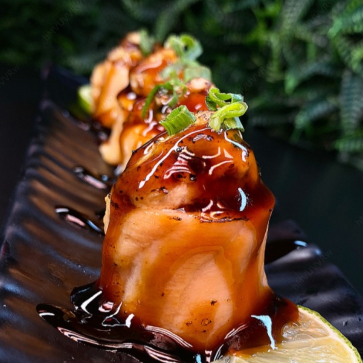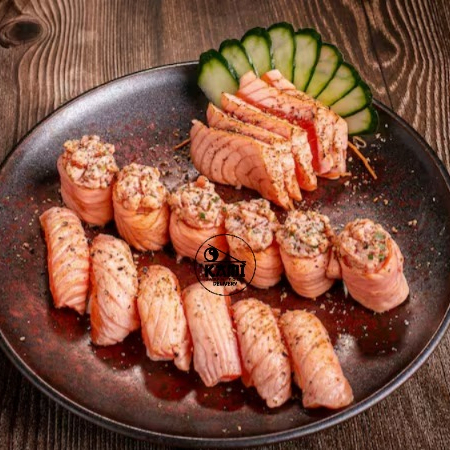 Combo espetacular para os amantes de salmão grelhado 5 unidadades de gunkan de pepino com salmão grelhado 5 unidadade niguiri skin 5 unidadade hot cheese