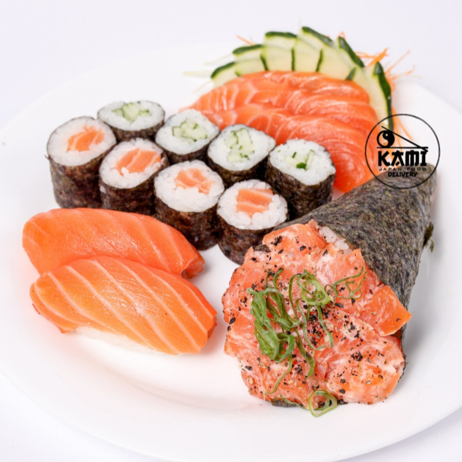 1 temaki de salmão 3 sashimi de salmão 2 niguiri de salmão 4 hossomaki de salmão 4 hossomaki de pepino