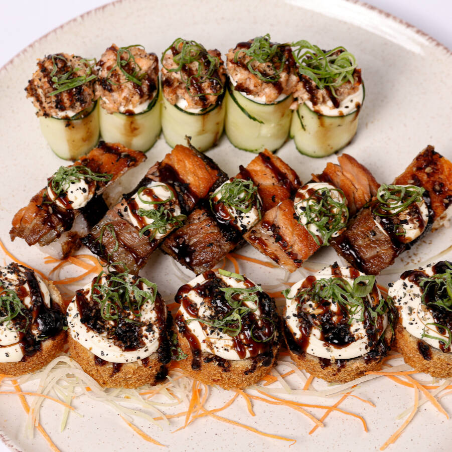 10 unidades de hot roll de salmão 10 unidades de gunkan de pepino com salmão grelhado 10 unidades de niguiri skin