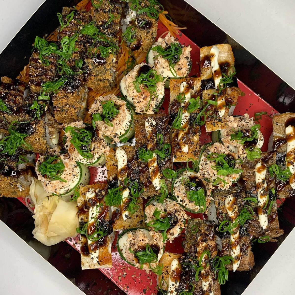 10 hot roll skin 8 uramaki skin 5 niguiri skin (Contém molho tarê, e gergelim.)