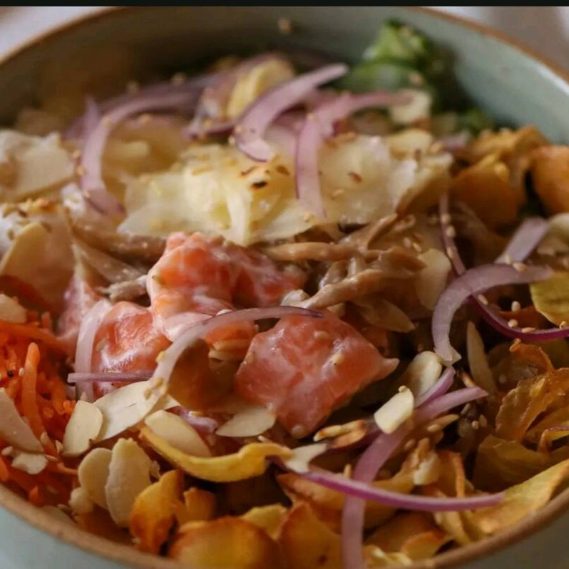 Arroz japonês e mix de folhas, salmao com cream cheese, shimeji, sunomono, cenoura, batata doce crispy, cebola roxa, gengibre, gergelim e castanha de caju xerem . Acompanha molho tarê.