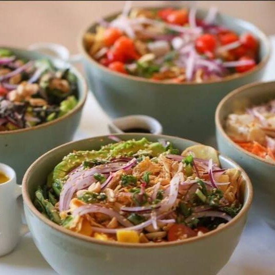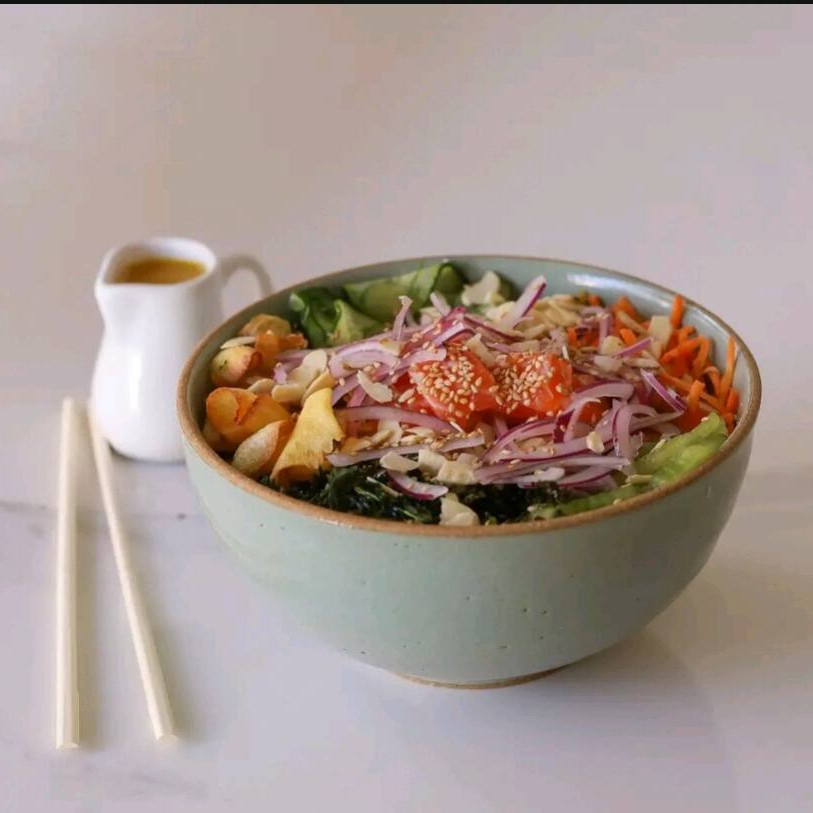 Arroz gohan, mix de folhas, tomate cereja,manga, abacate, batata doce chips, salmão com cream cheese, castaha de caju xerem, cebola roxa, cebolinha e gergelim. Acompanha molho shoyu