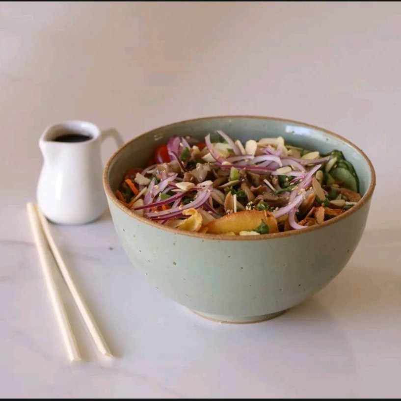Mix de folhas, repolho roxo, shimeji, tomate cereja, manga, sunomono, Batata doce crispy, cebola roxa, cebolinha, gergelim e ervilha wassabi. Acompanha molho Shoyu
