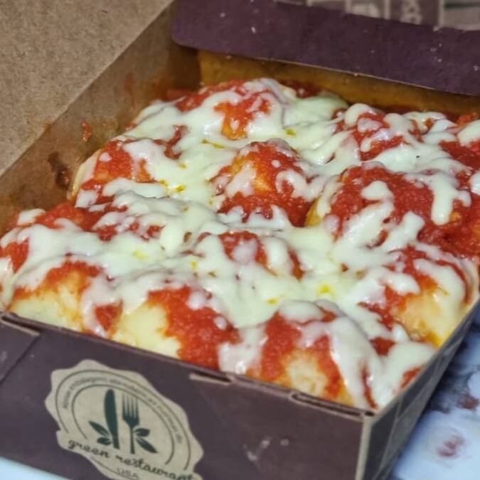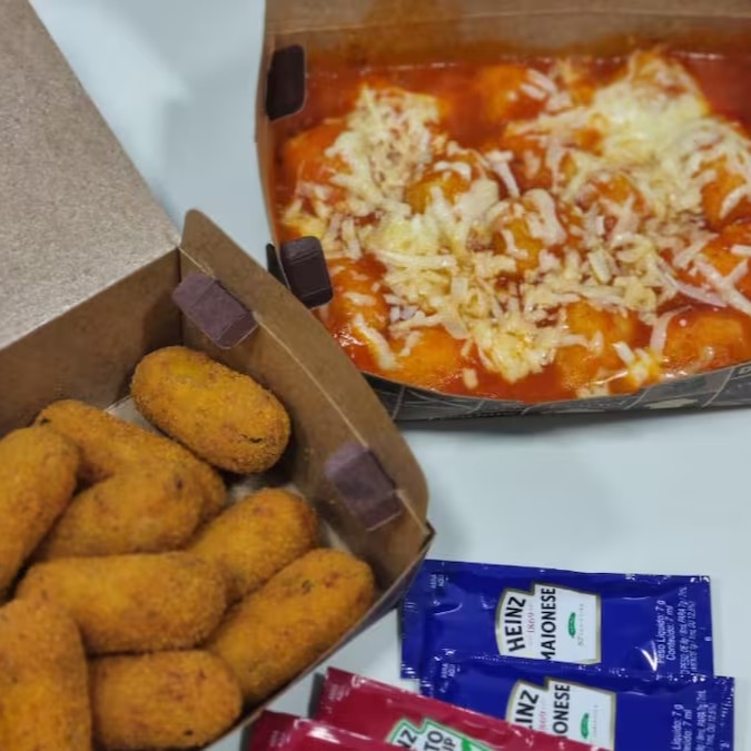 1 Box de 500 g Batata Recheado com Muçarela ao molho sugo mais parmesão por cima + 1 porção de Croquete de Carne já frito.