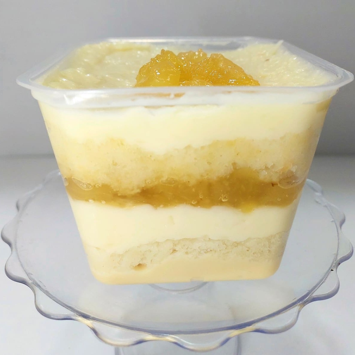 Bolo com massa super fofinha, intercalada com uma camada generosa de brigadeiro de coco em flocos e uma camada de abacaxi em calda, finalizado com brigadeiro de coco e uma porção de abacaxi. Serve 1 pessoa.
