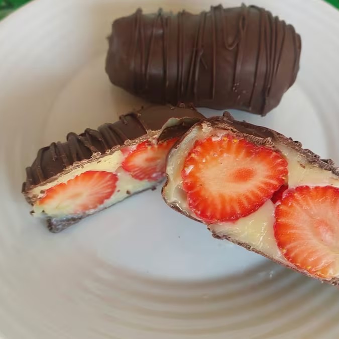 Perfeição de morango, enrolado no brigadeiro de leite Ninho, banhado no chocolate meio amargo. Irresistível!! Serve 1 pessoa. (100g)