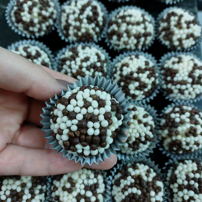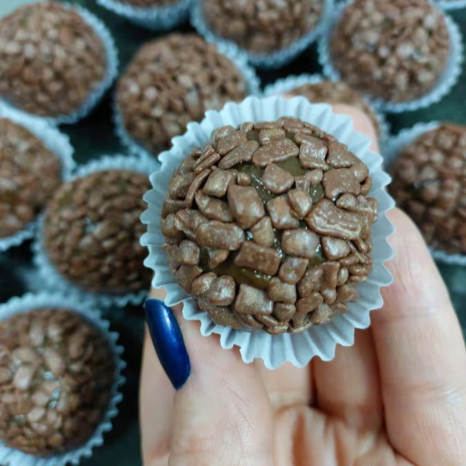 Combinação perfeita de Brigadeiro de Cacau 50% e Brigadeiro de Ninho enrolado em bolinhas de cereais crocantes. Serve 1 pessoa (30g)