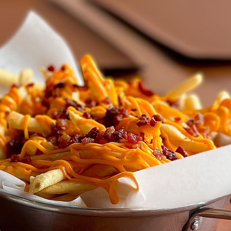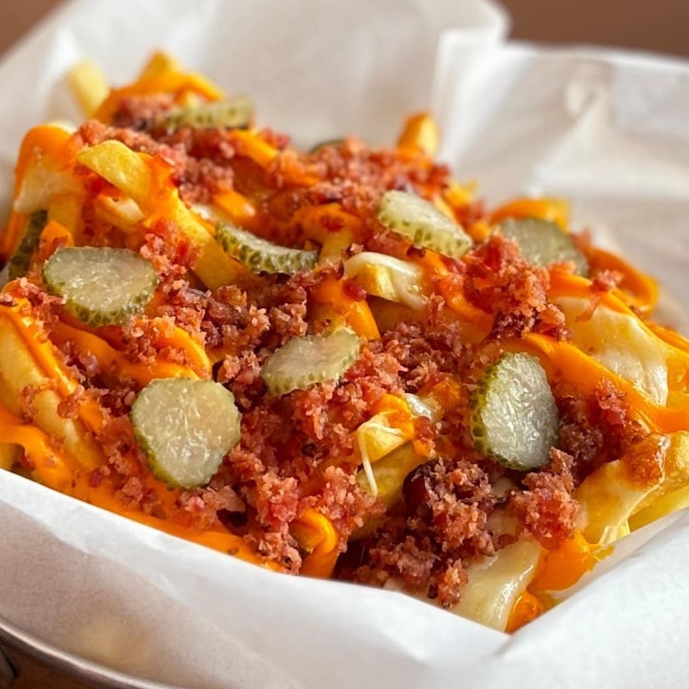 Porção generosa de batatas crocantes cobertas com uma camada cremosa de mussarela derretida, molho cheddar quente, cubinhos crocantes de bacon e um toque especial de picles.