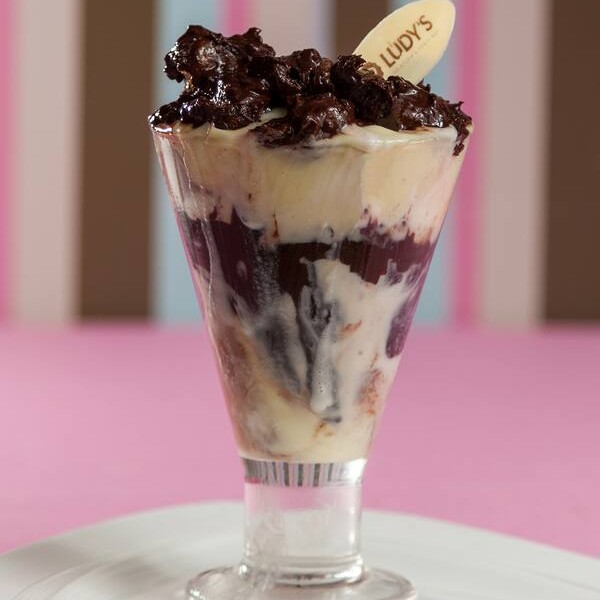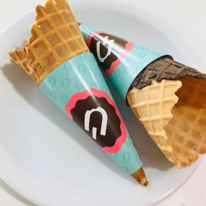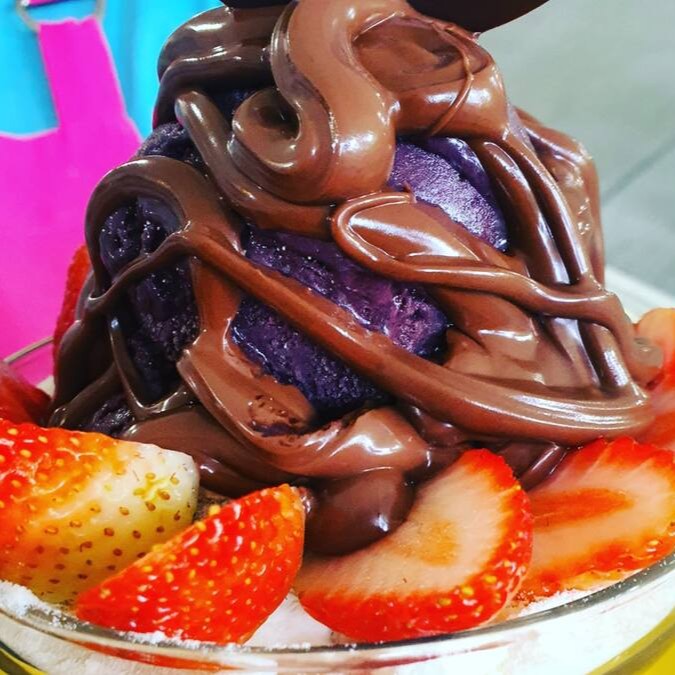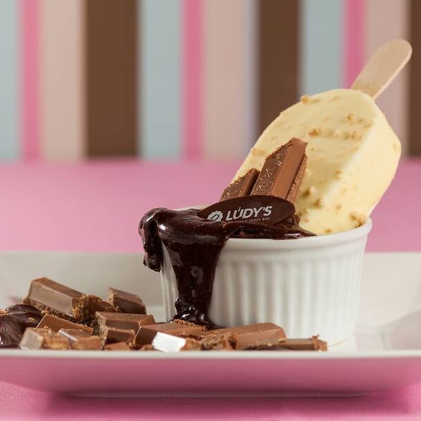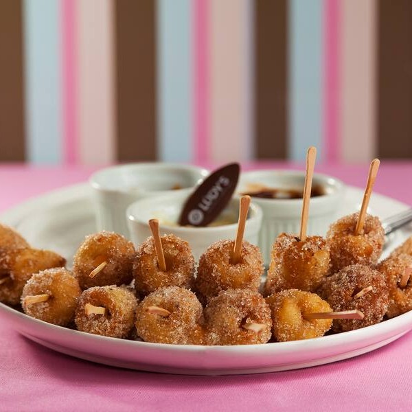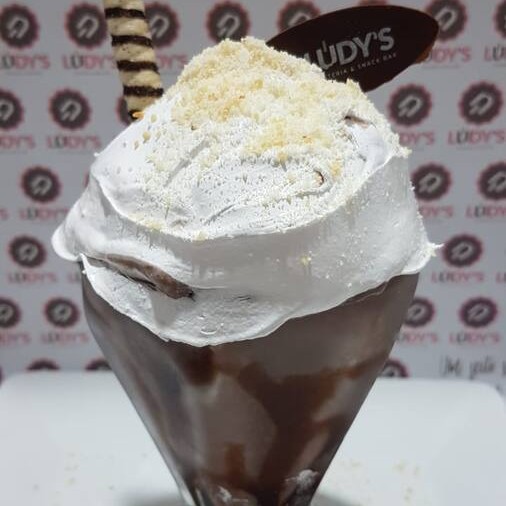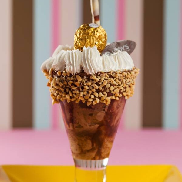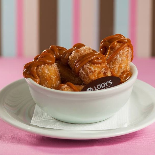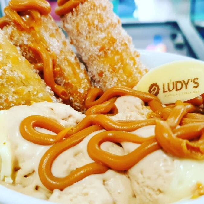 3 churros recheados de tamanho médio, 2 bolas de sorvete premium a escolher e cobertura de doce de leite ou chocolate.