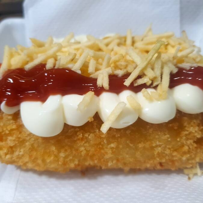 Massa de coxinha recheada com salsicha, requeijão, catchup, mostarda