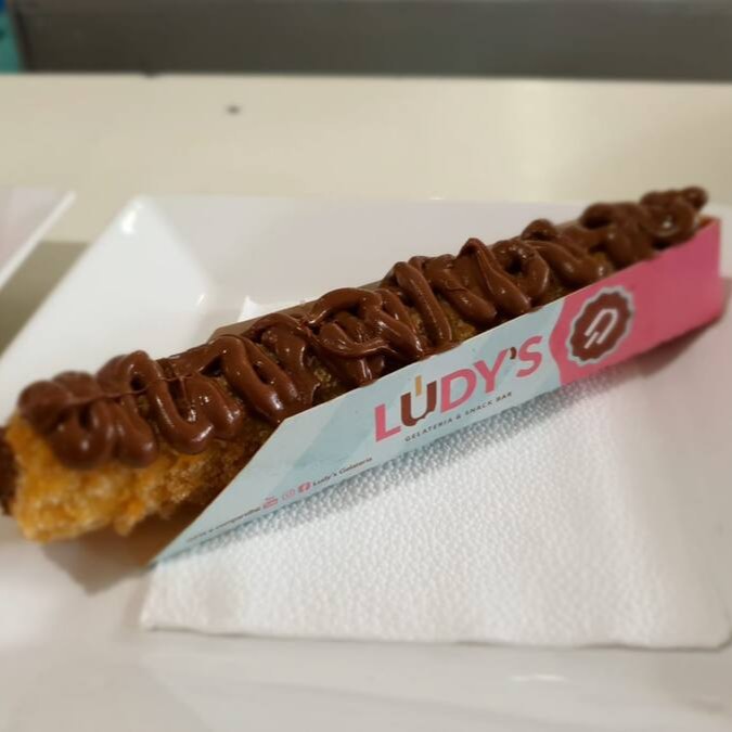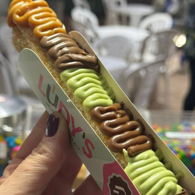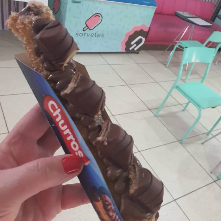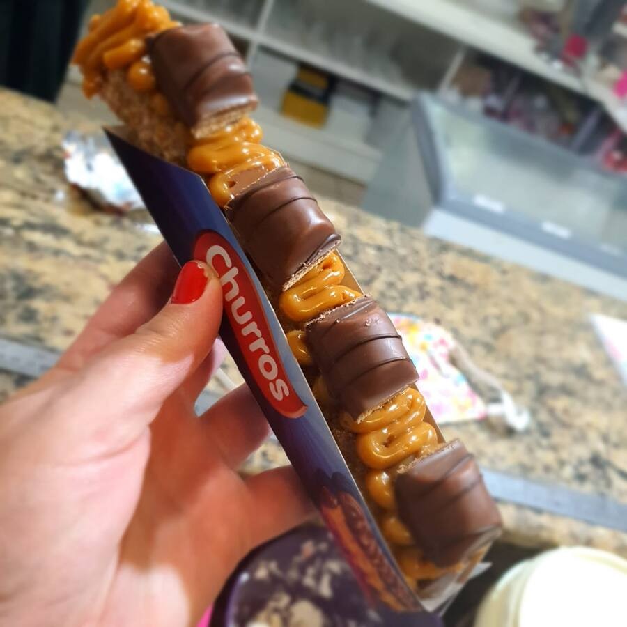 1 churros grande recheado e coberto com Doce de leite com 1 chocolate Kinder