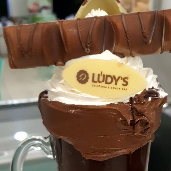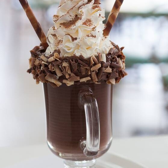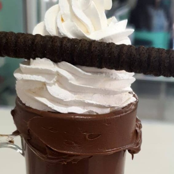 Chocolate quente Italiano, encorpado, acompanhado de bora de Nutella, creme Kitkat, chantily americano e chocolate Kit Kat
