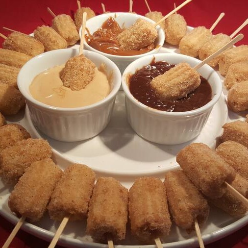 15 unidades de churros médios preparados na hora, com 3 acompanhamentos: doce de leite, chocolate e leitinho