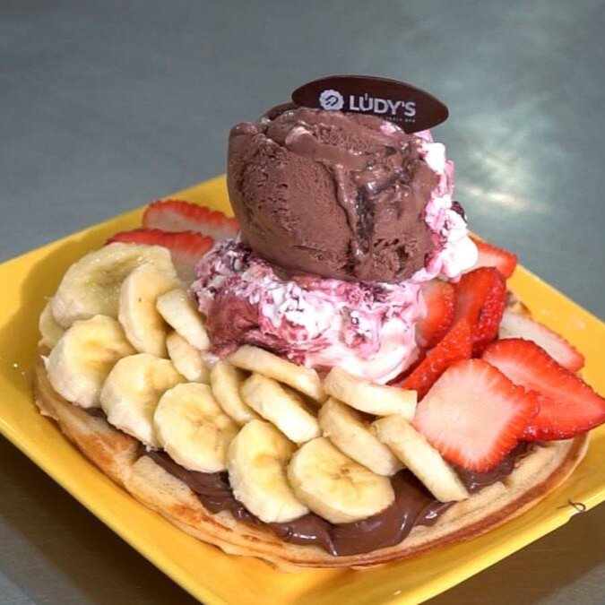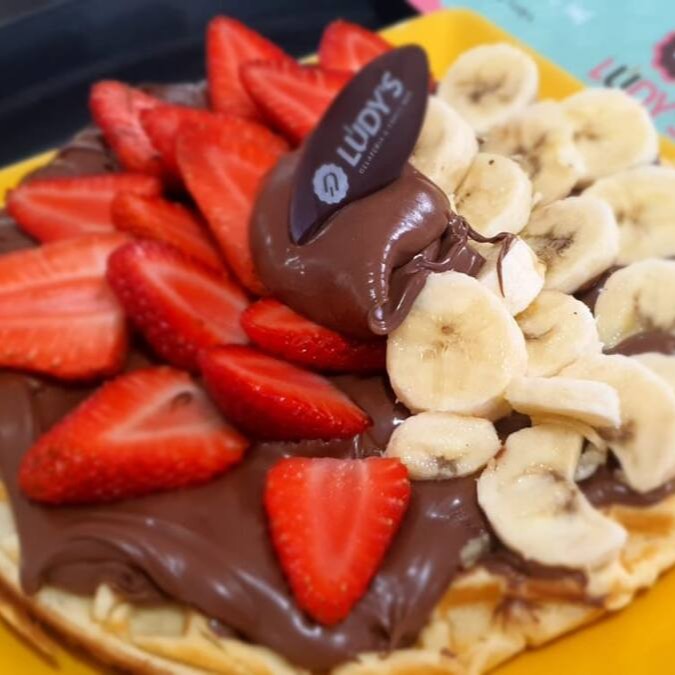 Maravilhoso wafle servido com Nutella, frutas morango e banana e 2 bolas de sorvete a escolher nos complementos