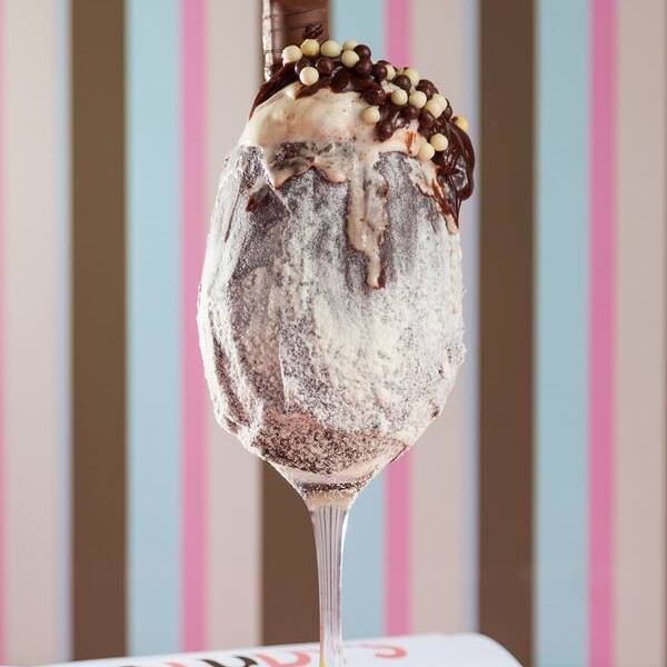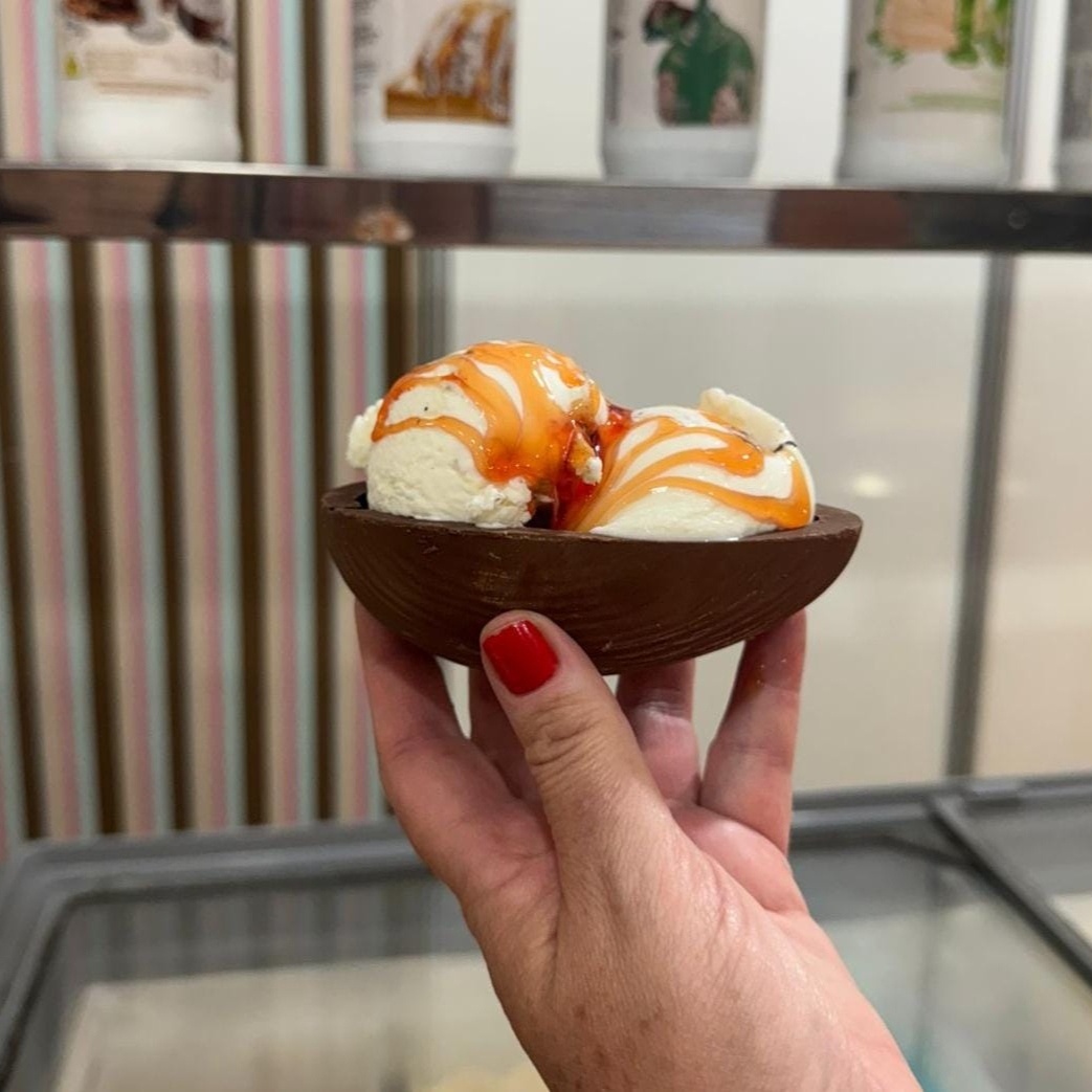 O ovo perfeito para adoçar seu dia: 2 bolas de sorvete, cobertura de chocolate e recheio generoso de M&M’s.