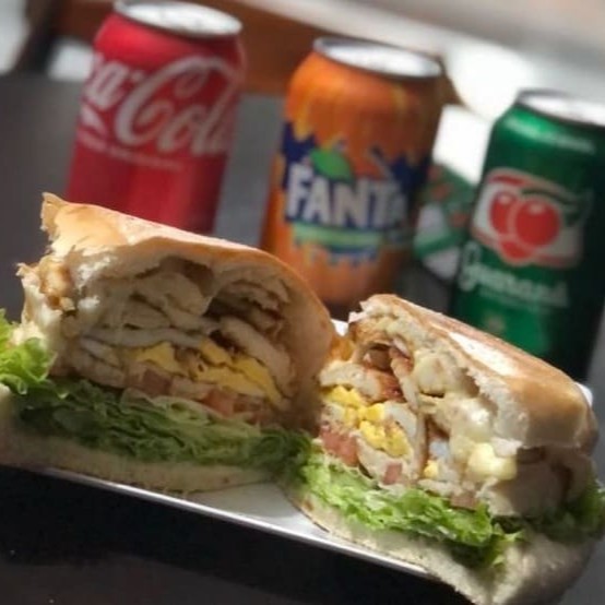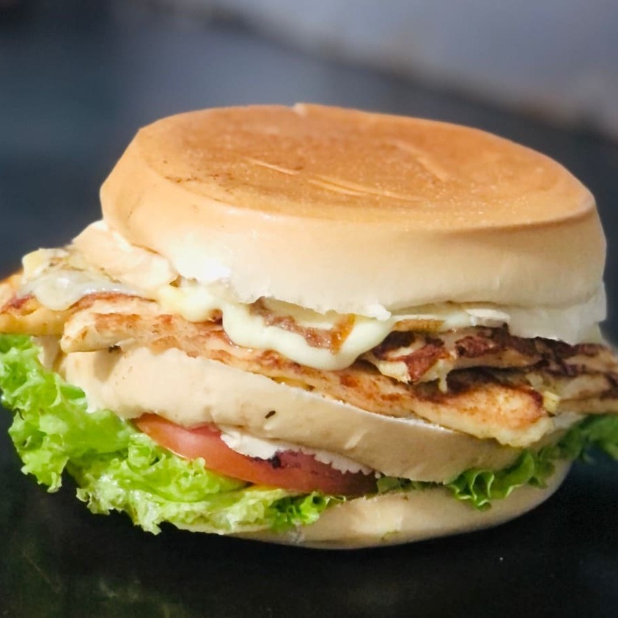 Pão filé de frango, ovo, bacon, presunto, mussarela e salada