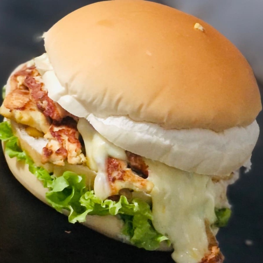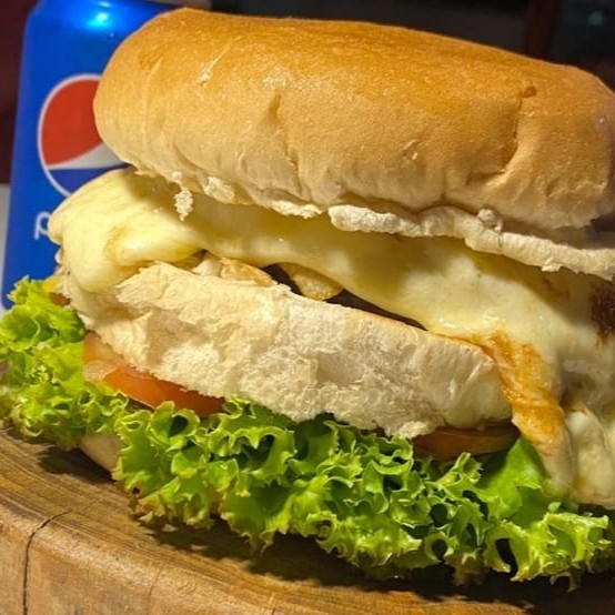 Pão, filé de frango, ovo, bacon, mussarela e salada