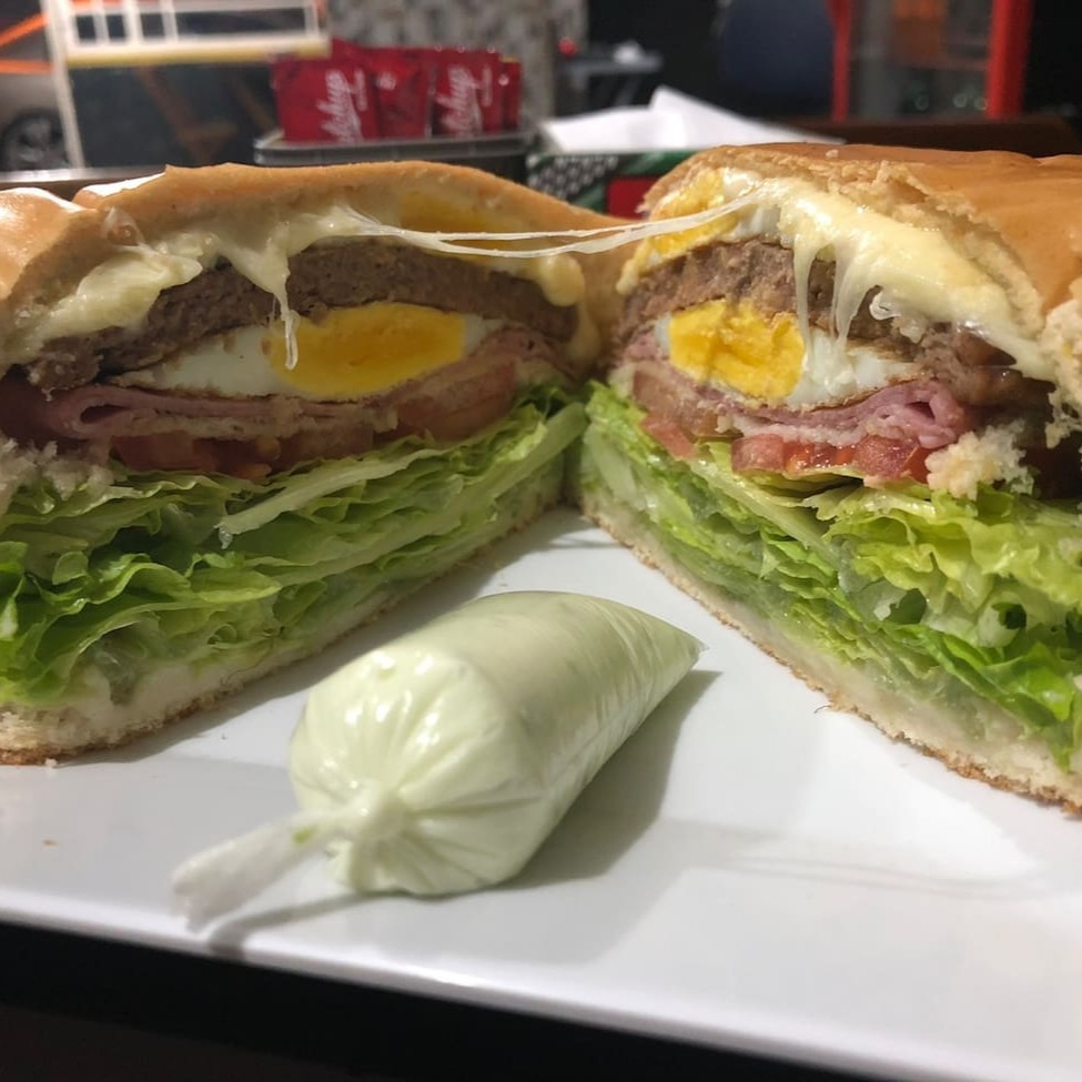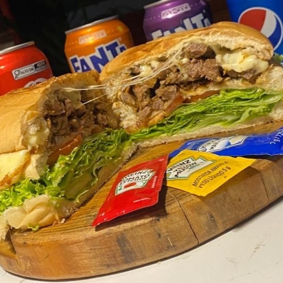 Pão, filé, mussarela, ovo, bacon, presunto e salada
